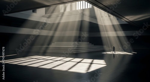 © Lionel, Obraz premium Illuminated Staircase with Dramatic Light Rays and a Lone Figure