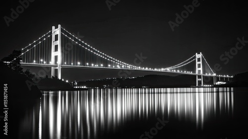 © Berkah1789, Fototapeta premium Illuminated Suspension Bridge at Night Reflecting in Water