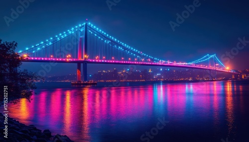 © sunny, Fototapeta premium Illuminated suspension bridge at night with vibrant blue and pink lights reflecting on calm water under deep blue sky