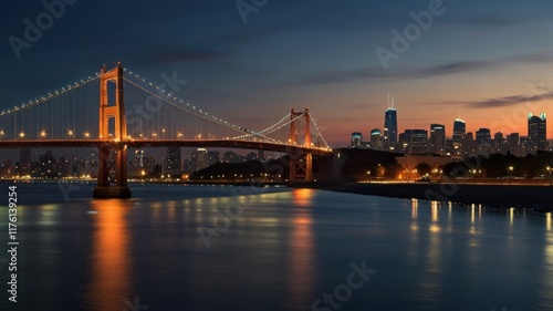 © Syarif, Obraz premium Illuminated suspension bridge at sunset over city skyline reflected in water.