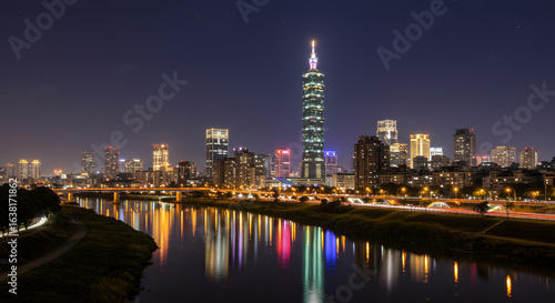 Naklejka premium Illuminated Taipei city skyline at night featuring the iconic Taipei 101 tower with vibrant light reflections on the Keelung River.