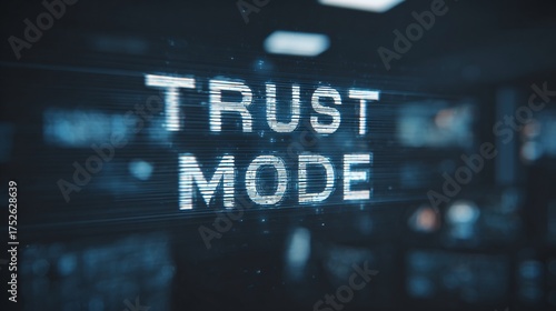 Obraz premium Illuminated text reading 'TRUST MODE' in a modern, tech-inspired setting.