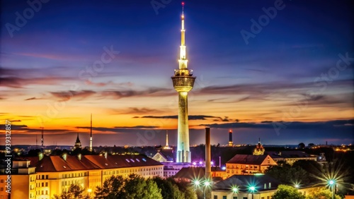 © arri, Naklejka premium Illuminated Tower Over Cityscape at Twilight
