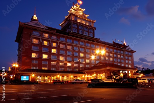 © aicandy, Fototapeta premium Illuminated traditional-style hotel exterior with glowing lights showcasing intricate architectural design under twilight sky