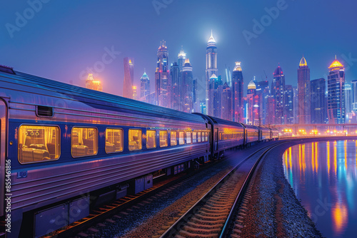 Fototapeta premium Illuminated train traveling beside water with the glowing skyscrapers of...