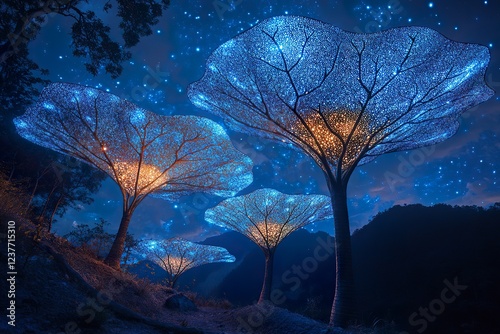 © Yuliana, Obraz premium Illuminated Trees Under a Starlit Night Sky