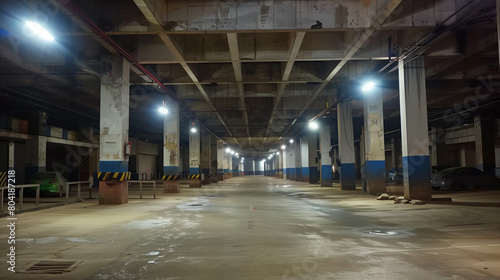 Fototapeta premium Illuminated underground parking garage with columns and empty spaces.