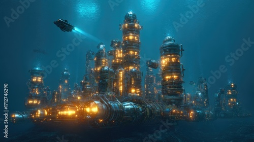© Larisa, Fototapeta premium Illuminated underwater city showcases advanced mining technology