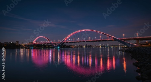 Obraz premium Illuminated urban bridge at night with stunning reflections over calm water