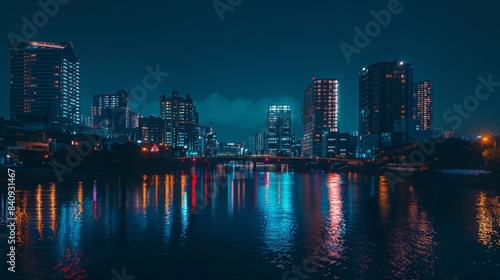 Fototapeta premium Illuminated Urban Cityscape at Night Featuring Skyscrapers, Neon Lights, and...