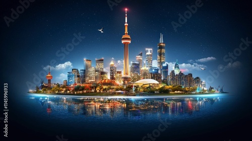 Fototapeta premium Illuminated urban nightscape of toronto city skyline aerial digital art viewpoint showcasing architectural marvels by the waterfront