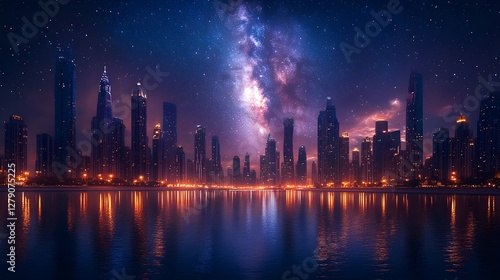 Fototapeta premium Illuminated Urban Skyline Night Stars Reflections Milky Way Dreamlike Cityscape | AI Generated