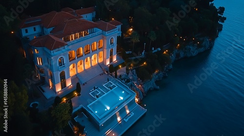 © Rastika, Obraz premium Illuminated waterfront villa nestled on a cliffside at twilight