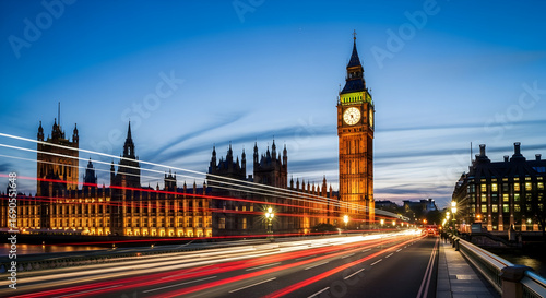 © art.mine, Fototapeta premium Illuminated Westminster Palace and Big Ben at night with blurred car lights in London England
