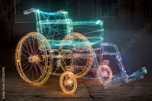 Fototapeta premium Illuminated wireframe wheelchair representing futuristic accessibility technology
