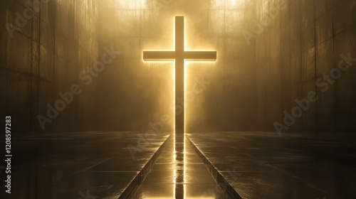 Naklejka premium Illuminated wooden Christian cross stands in tranquil, misty setting,...