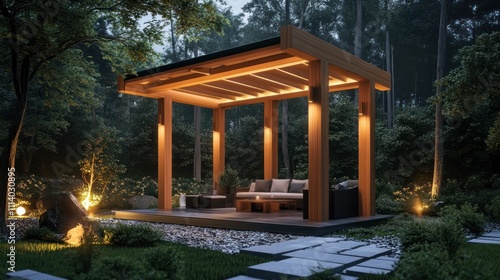 Naklejka premium Illuminated Wooden Gazebo in a Serene Forest Setting