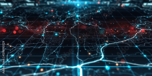 © Habibur Rahaman, Obraz premium Illuminated world map with glowing lines and dots on a grid background in a futuristic style