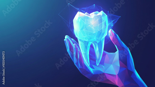 Fototapeta premium Illustrate a dentist holding a tooth in their hands, designed in a futuristic polygonal style.