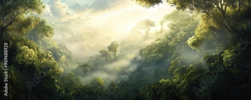 Fototapeta premium Illustrate a dreamy panoramic view of a mystical forest at dawn, where sunlight filters through lush trees, playing with shadows and ethereal mist