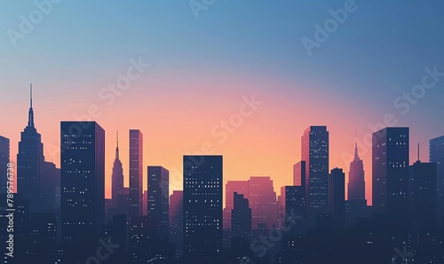 Fototapeta premium Illustrate a minimalist cityscape at dusk using sleek vector graphics, showcasing a few towering skyscrapers against a gradient evening sky