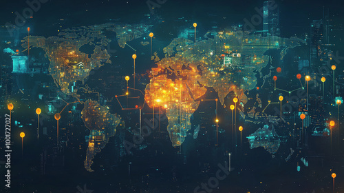 Fototapeta premium Illustrate a world map with markers showing areas of development, such as new infrastructure, renewable energy projects, or technological hubs.