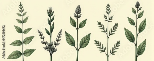 Naklejka premium Illustrated botanical collection of various leafy plant specimens with seed...