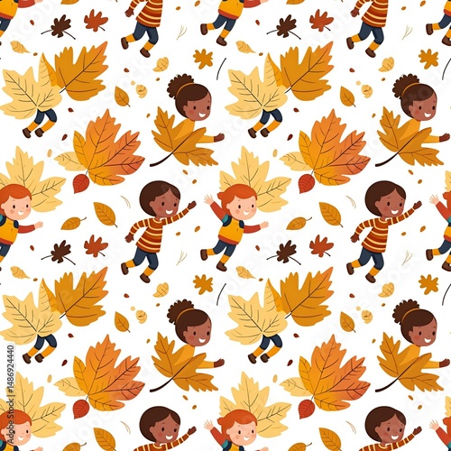 © Daniel, Obraz premium illustrated children playing in autumn leaves