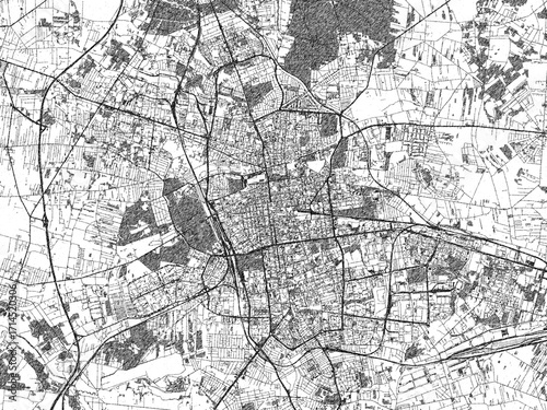 Naklejka premium Illustrated city map of Lodz, Poland, in black and white, showing roads and...