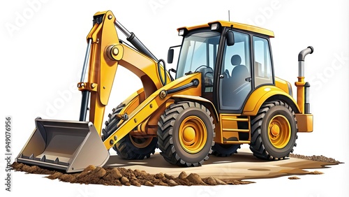 © Four888, Fototapeta premium Illustrated construction backhoe loader digging into the ground with machinery details and subtle shadows, set against a clean white background with crisp outlines.