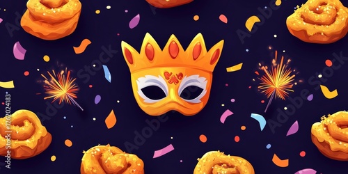 Fototapeta premium Illustrated delicious cinnamon rolls with a festive crown, confetti, and sparklers on a dark background.