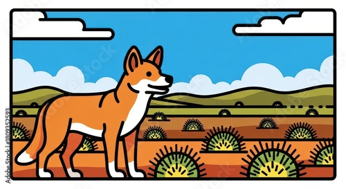 Obraz premium Illustrated fox in desert landscape with cacti and clouds on sunny day