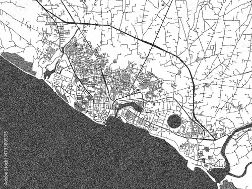 © W&S Stock, Naklejka premium Illustrated map of Veraval, India, in black and white hand-drawn digital style.