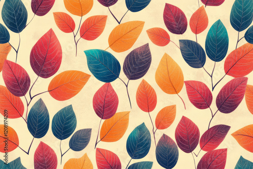 © Asim-Backgrounds, Fototapeta premium illustrated seamless autumnal leaf pattern with colorful fall foliage and watercolor design for vibrant background texture