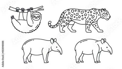 © as, Naklejka premium Illustrated south american animals: sloth, jaguar and tapir in minimalist outline style