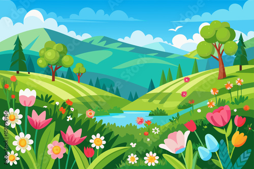 © Shanjoy, Fototapeta premium Illustrated Spring Landscape with Vibrant Flowers