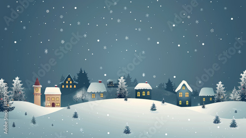 Naklejka premium Illustrated winter village scene with snow-covered houses and trees, evoking...