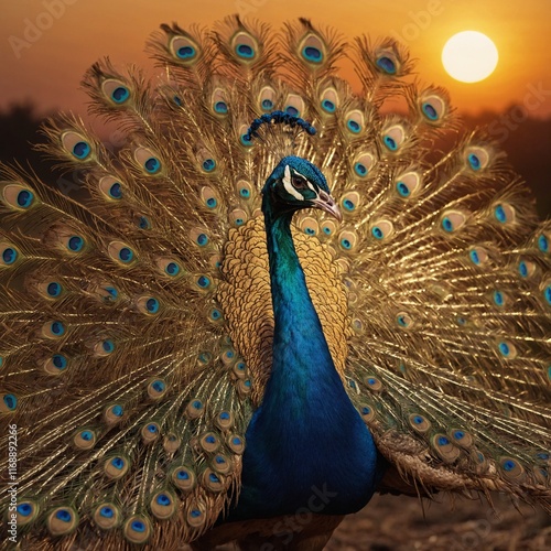 © Muhammad, Obraz premium Illustration: A peacock spreading its vibrant, multicolored pinions under a golden sunset.