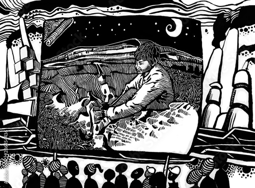 Obraz premium Illustration, art, printmaking, line drawing, boys, spectators, wilderness,...