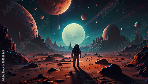 © Arief, Obraz premium Illustration background Of an astronaut is exploring an alien landscape