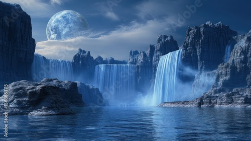 © Akstem, Fototapeta premium Illustration: Beautiful blue moonlit landscape with waterfalls and mountains.