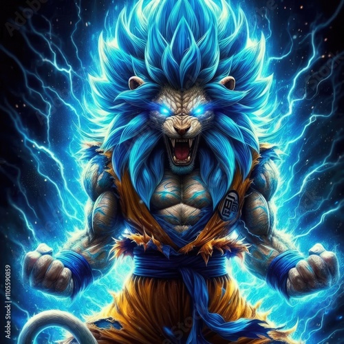 Naklejka premium illustration blue angry lion with blue energy aura, ai