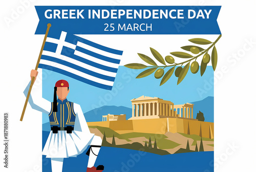 © Diane, Fototapeta premium Illustration celebrating Greek Independence Day with flag and historical elements.