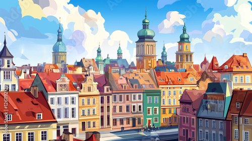 © Dirk, Fototapeta premium Illustration, Cityscape of Poznan in Poland , touristic advertisement poster. Beautiful old historical houses in the city centre. Touristic must-see city eastern Europe. Beautiful travel destination
