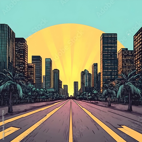 © Siasart Stock, Fototapeta premium Illustration Cityscape Sunrise Road Palm Trees Buildings Urban Scene