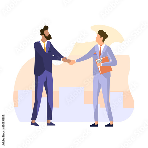 © Diana, Fototapeta premium Illustration concept for concluding a contract, insurance, business negotiations, services of a lawyer, lawyer, notary, insurance agent. Two men shake hands to make a deal .