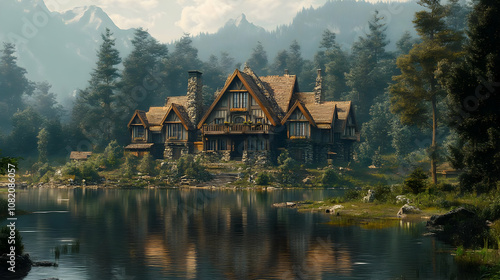 © queen, Fototapeta premium Illustration - Cozy Cottage by the Lake in a Serene Forest Setting