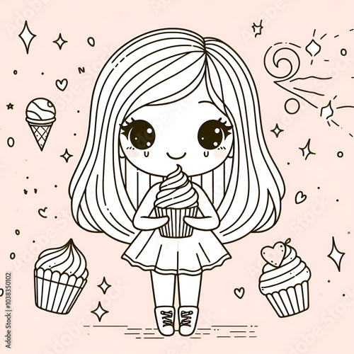 © EnImages, Obraz premium Illustration Cute girl with happy face holding cupcake