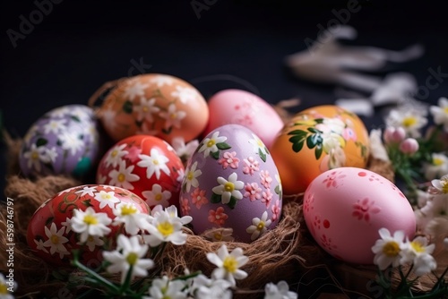 © Jorge Ferreiro, Fototapeta premium illustration, decorating easter eggs with spring flowers, ai generative.