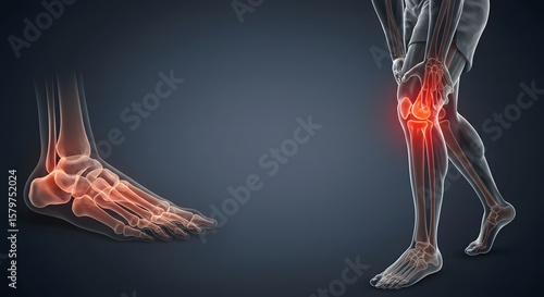 Obraz premium Illustration depicting foot and leg bones with highlighted red areas indicating pain or inflammation in the ankle and knee joints.